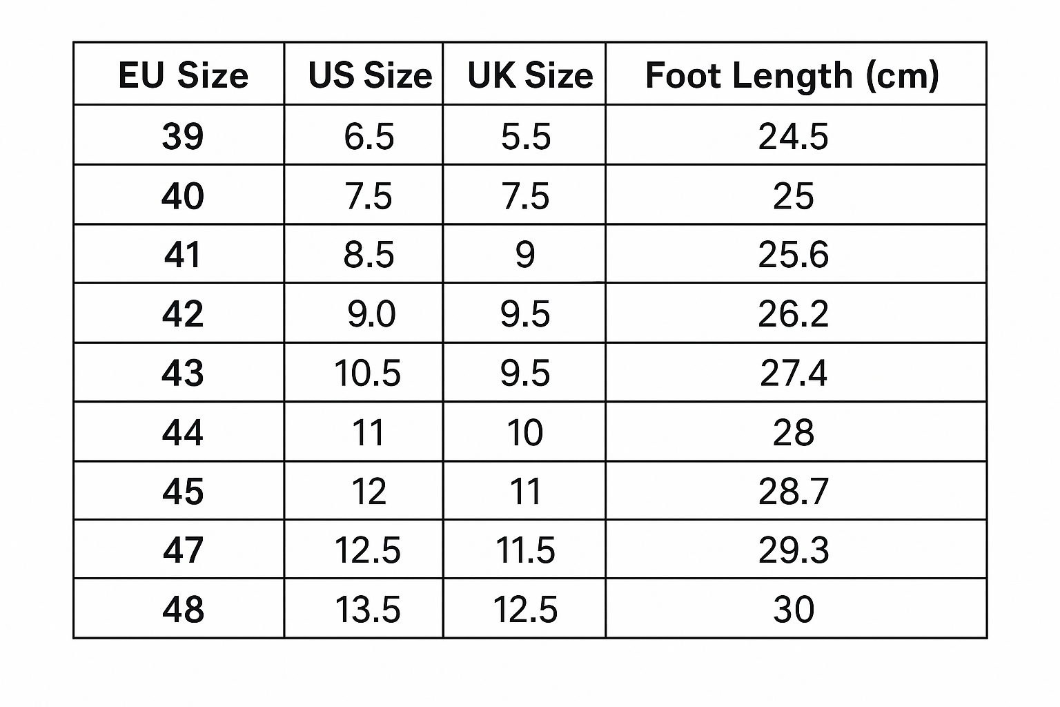 | EU Size | US Size | UK Size | Foot Length (cm) |