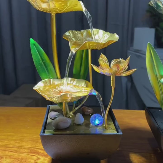 Its gold lotus leaves and green stems create a sculptural décor piece that suits various styles, including modern, nature-inspired and minimalist interiors. The continuous flow produces a quiet trickle that supports relaxation, making it a thoughtful choice for bedrooms, home offices, yoga areas or calming gift occasions like housewarmings.