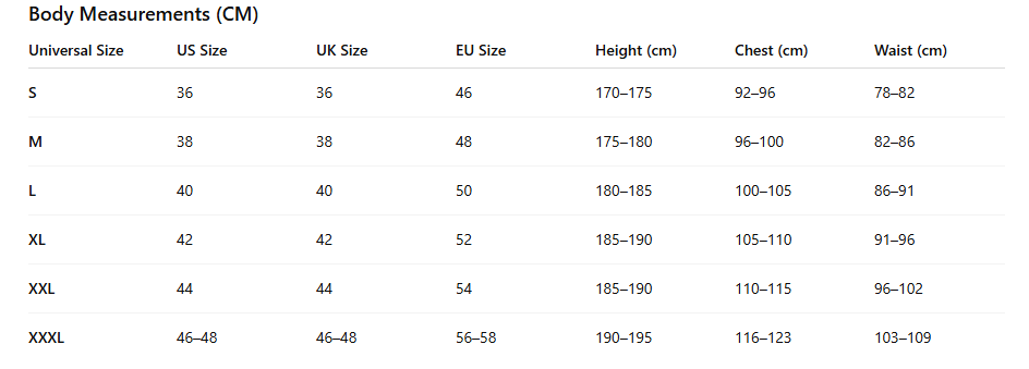 | Universal Size | US Size | UK Size | EU Size | Height (cm) | Chest (cm) | Waist (cm) |