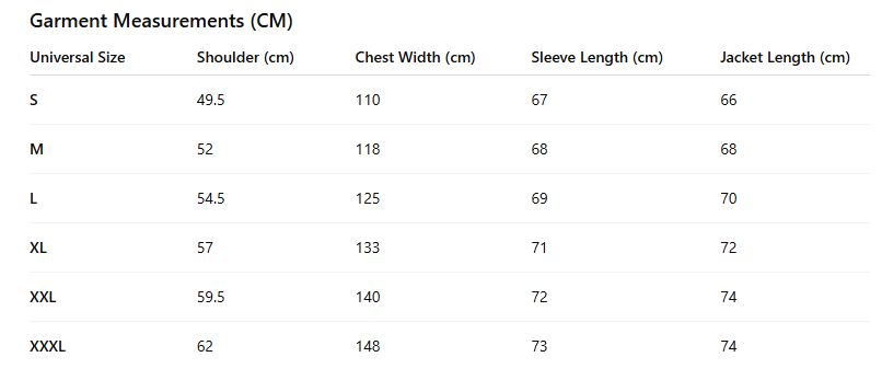 | Universal Size | Shoulder (cm) | Chest Width (cm) | Sleeve Length (cm) | Jacket Length (cm) |