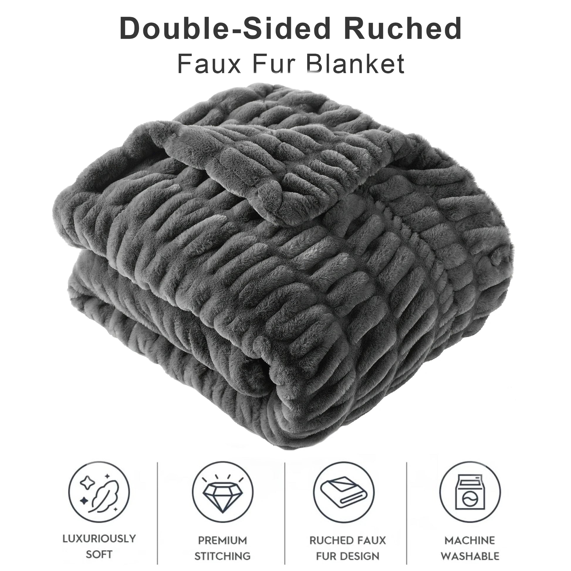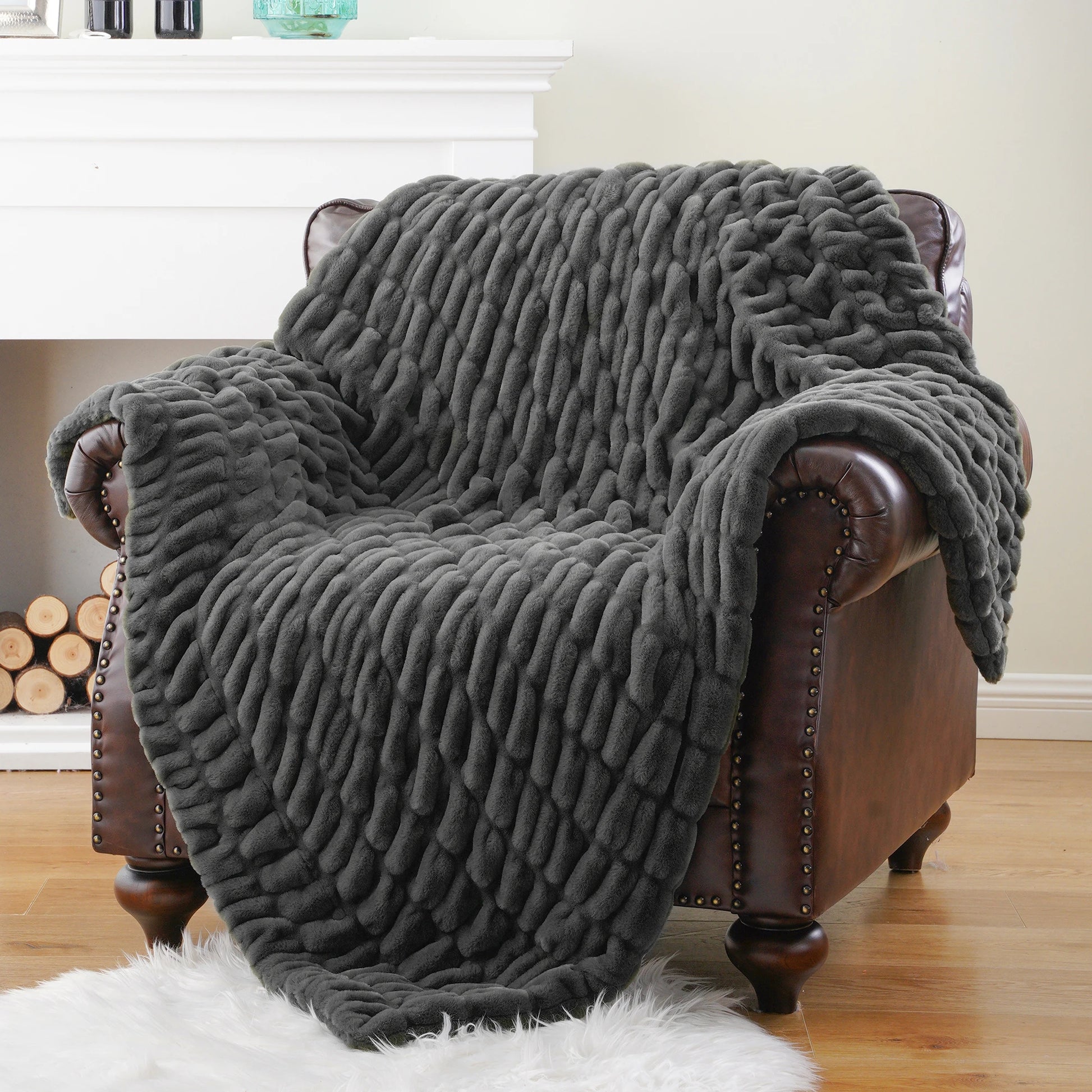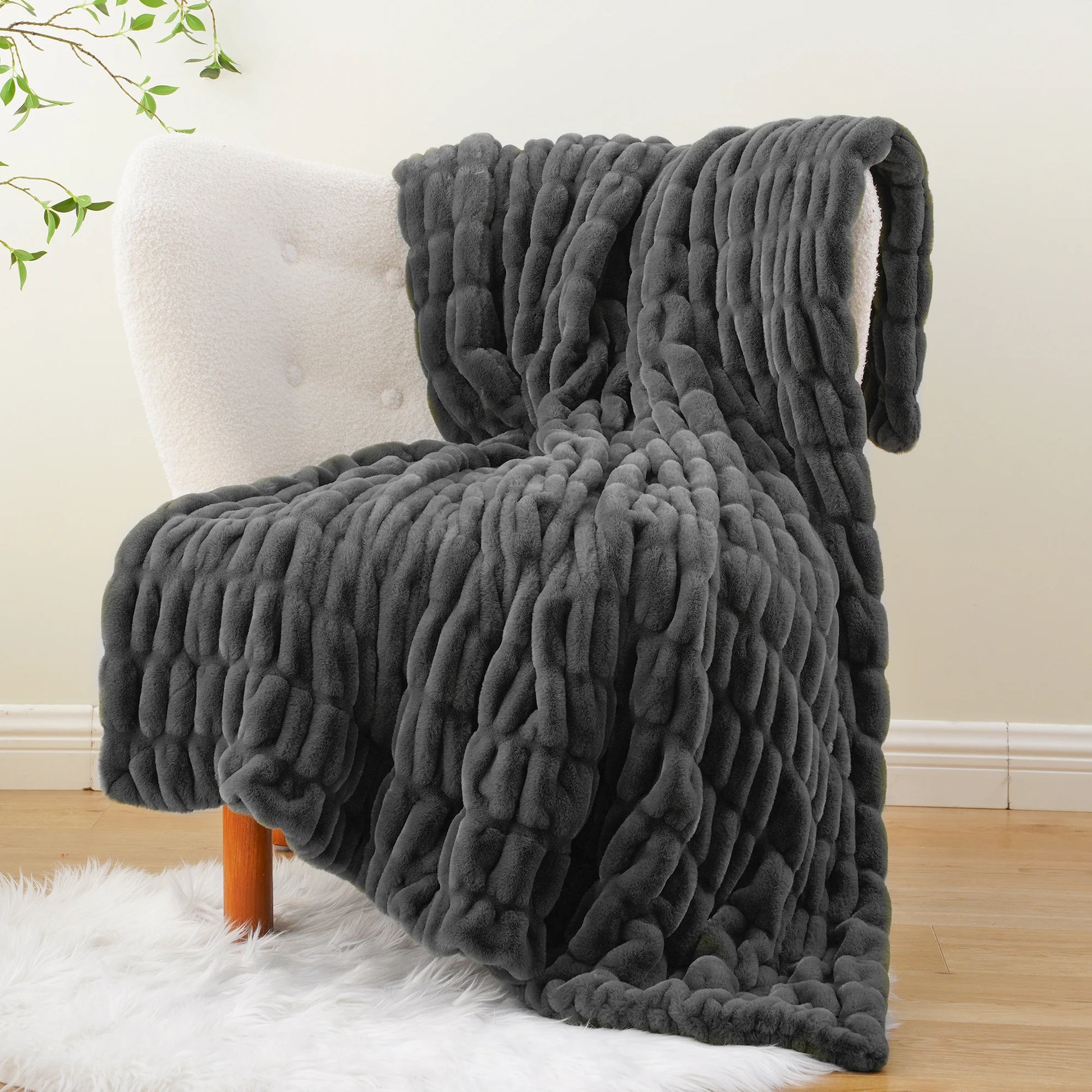 These faux rabbit fur throw blankets are crafted with a dense, ruched texture that provides both warmth and visual softness. The fabric is made from 100% polyester microfiber, giving the throw a smooth, velvety touch on both sides. This construction helps the blanket hold its shape while offering a cushioned, weighty drape when placed over a sofa or bed.