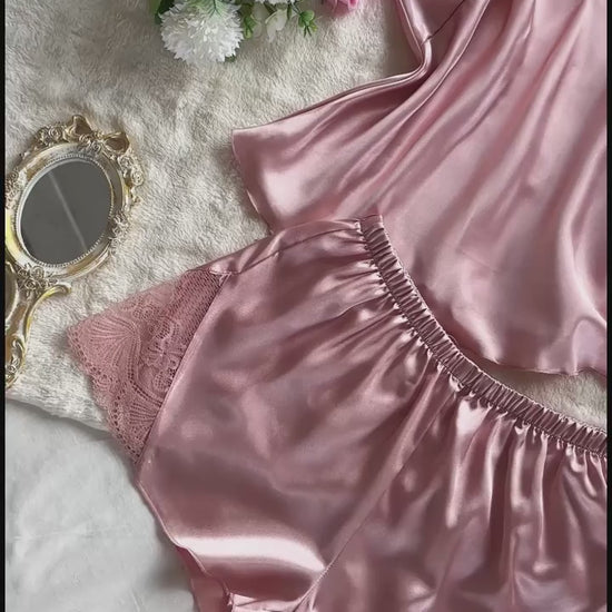 This two-piece satin pajama set offers a smooth, lightweight feel for relaxed evenings. Featuring a lace-trimmed V-neck cami and elastic-waist shorts, it combines chic style with comfortable wear.